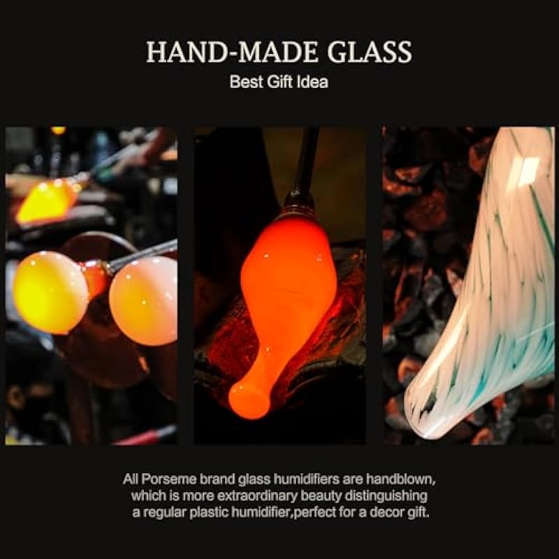 - HANDMADE GLASS DIFFUSER – Our Porseme 100ml aroma diffusers are 5” in diameter and 9” in height. They are handblown glass so each glass globe is unique. 100ml essential oil diffuser lasts for 4 hours and has a good output of mist. Fits a room not larger than 15*15(ft). You can place in any area and relax.