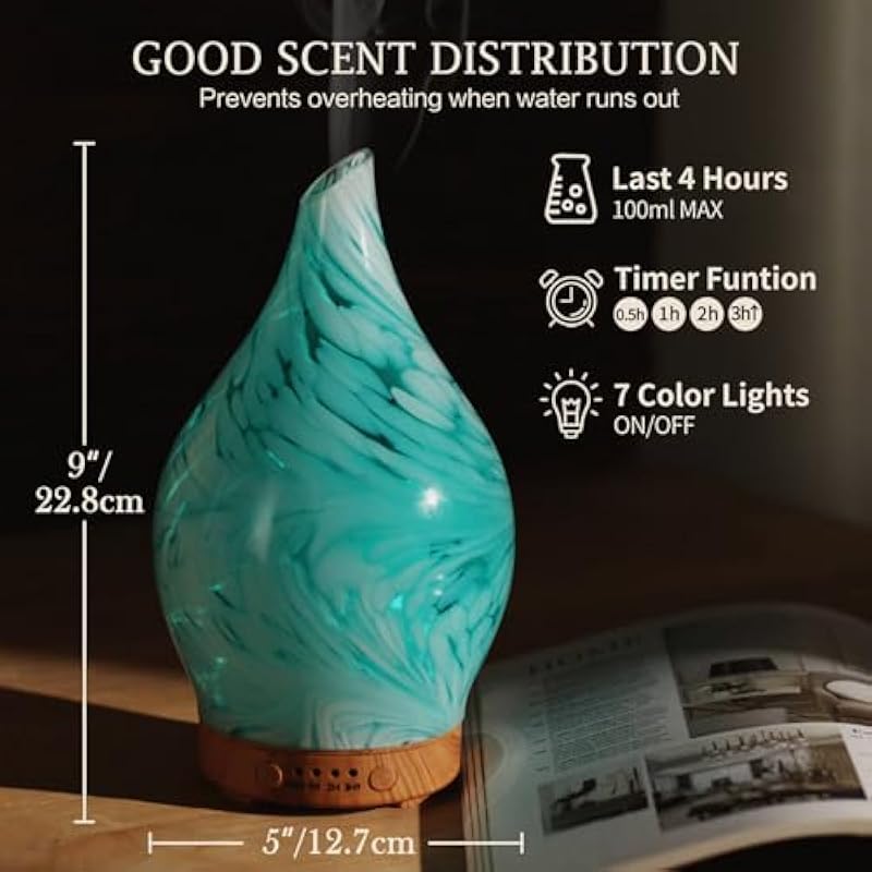 - UNIQUE ART DECORATIVE DESIGN – Our 100ml glass essential oil diffuser has an elegant starry pattern glass cover and wood grain decorative base. It is very suitable for your bedroom, living room, children’s room, study room, office, and yoga room.