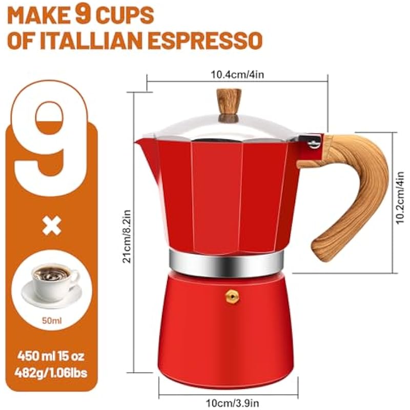 - Easy to Use: When you use it for the first time, the coffee pot may emit an unpleasant smell, please don’t worry too much, this is a normal phenomenon. Pls add tea, oranges, detergent, or other items to remove odor and wash several times before use. Fill the lower part of the italian espresso maker with water, put the ground coffee into the percolator, put the top on, and place the espresso pot on the cooker to boil. After using the stovetop espresso machine, please rinse it with clean water