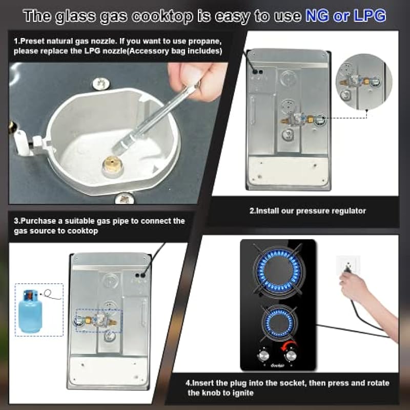 - [Dual Fuel Natural Gas/Propane Gas Stove] The gas stoves of these two burners can use either natural gas or liquid propane gas. Its initial configuration is for natural gas. If you use liquefied gas, don’t worry, the operation is simple. You only need to replace the corresponding LPG nozzle. Tools and nozzles are in the accessory pack.