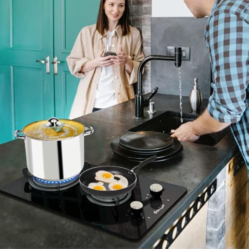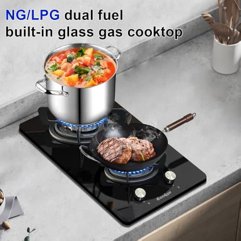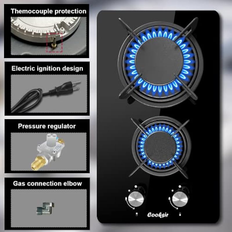 - [Easy to Clean] Cooksir 12 inch gas stove USES a thick black crystal glass panel and looks clean and elegant. When cleaning, you only need to clean with a damp cloth or add a little soapy water. The gas stove design is relatively monotonous, which can save better kitchen space.