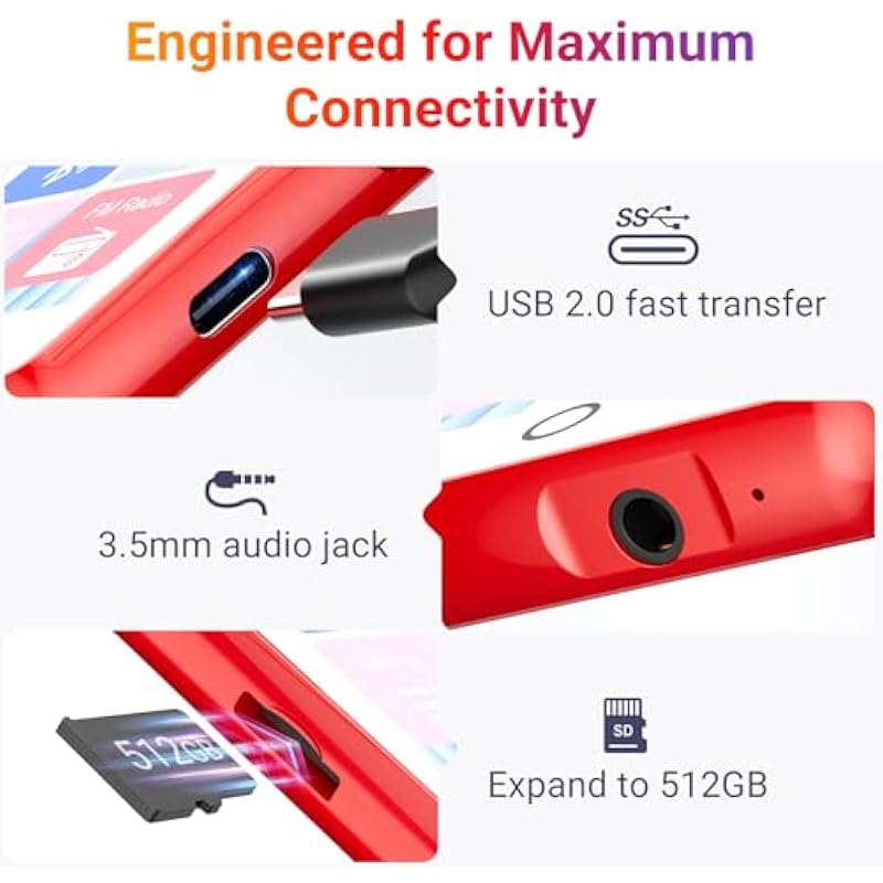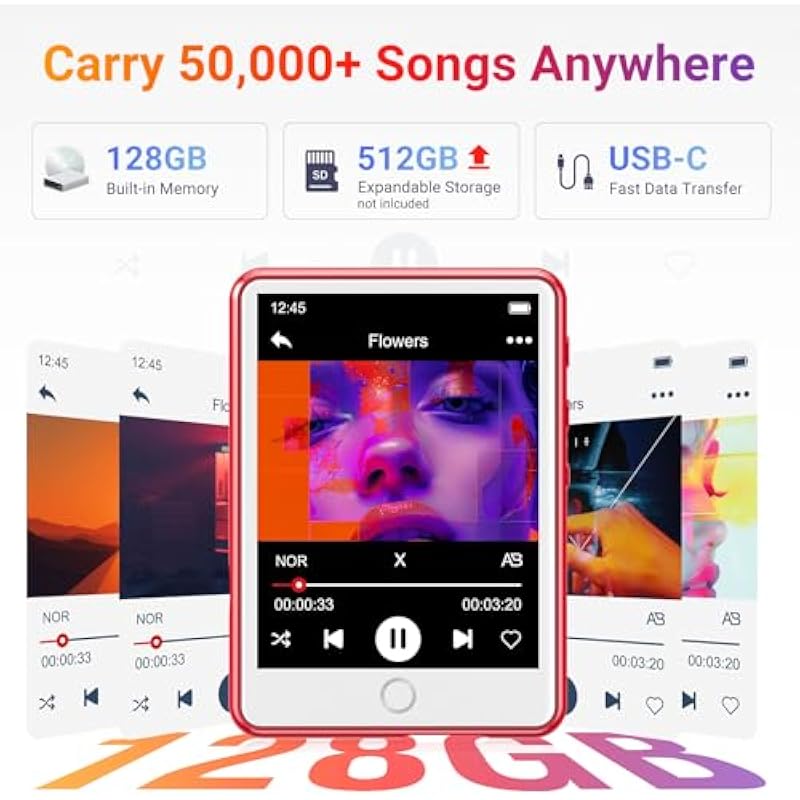 - Extra-large internal memory of 128GB, expandable up to 512GB:This MP3 player can store even more high-quality lossless music. This greatly satisfies your need to store songs, videos, audiobooks, so you can enjoy music anytime, anywhere. (The player is equivalent to the form of a USB flash drive or card reader, the main purpose of connecting to the computer is to recognize the internal storage space or external memory card storage space)