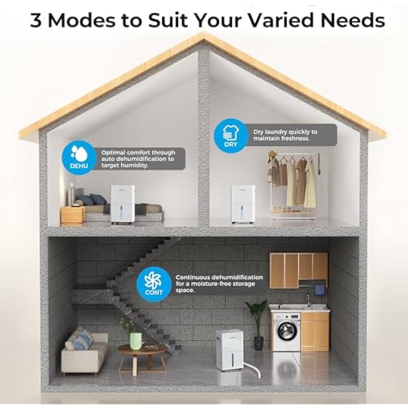 - 3 Smart Modes for Customized Humidity Control: Experience ultimate flexibility with our dehumidifier for basement, featuring 3 intelligent modes: DEHU for balanced humidity, DRY for faster laundry drying, and CONT for continuous moisture removal. Designed as a whole house dehumidifier, it adapts to your needs while optimizing energy efficiency for a smarter, healthier home