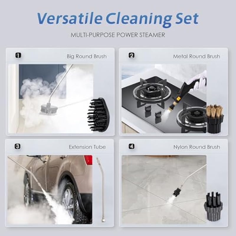 - [Powerful Cleaning Capability]: Boasting a robust 1500W engine and 4bar/58psi of potent force, this high-pressure steam cleaning device excels in dissolving stubborn grease and dirt. Its effectiveness spans across a variety of settings, enabling effortless cleansing of kitchens, bathrooms, living areas, and vehicles with its steam power for tiles and grout.