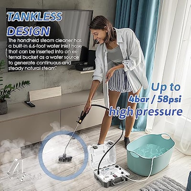 - [Innovative Water Supply System]: This portable steam cleaner features an innovative tankless design, incorporating a 6.6-foot water inlet hose that connects directly to any external water bucket. This setup ensures a consistent and uninterrupted flow of natural steam, eliminating the inconvenience of carrying a cumbersome tank during the cleaning process.