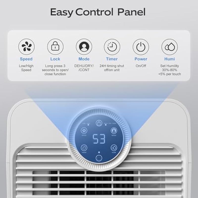 - 3 Dehumidification Modes for Home: In DEHU mode, you can adjust humidity levels 5% from 30% to 80% to set a comfortable humidity range of 40%-60%. Dry mode effectively removes moisture from clothes and is perfect for continuous rainy seasons, reduce odor. CONTI mode will continous work to drop the humidity, perfect for extremely humid spaces like basement, bathroom etc (Using with drain hose on CONT mode to avoid frequently empty tank)