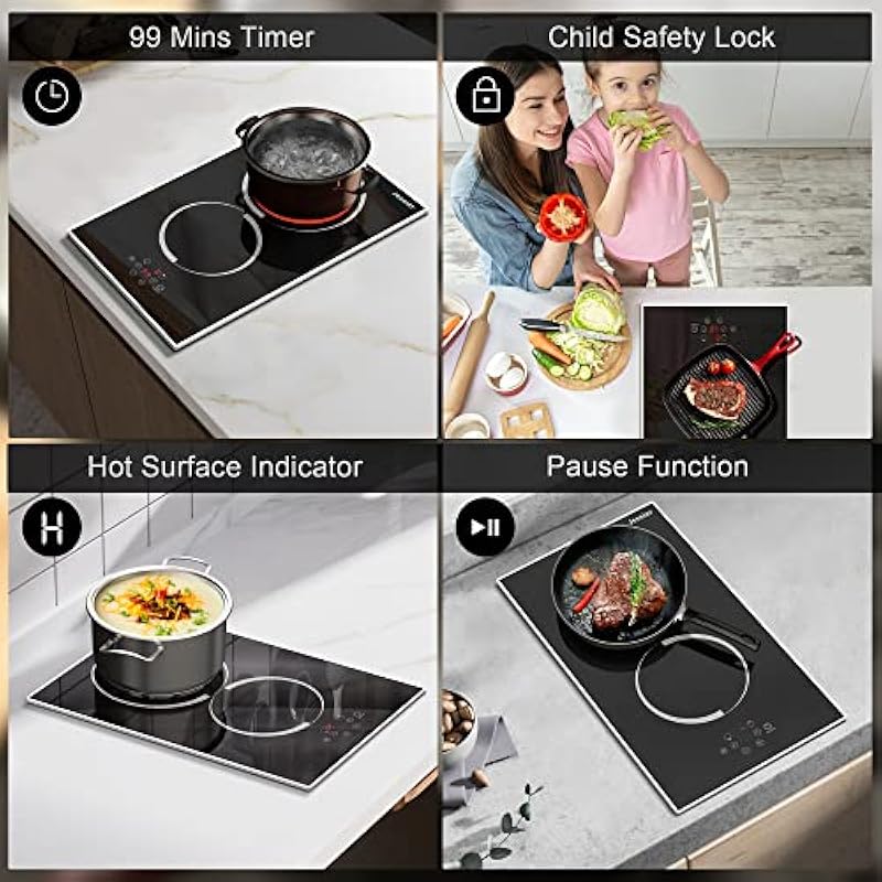 - 【Multi functional electric ceramic cooktop】This 12” inch electric cooktop is equipped with many advanced features, such as a 99 minute timer, automatic shutdown, child safety lock, high temperature warning, pause function, overheating protection function, using these functions can make your cooking easier.