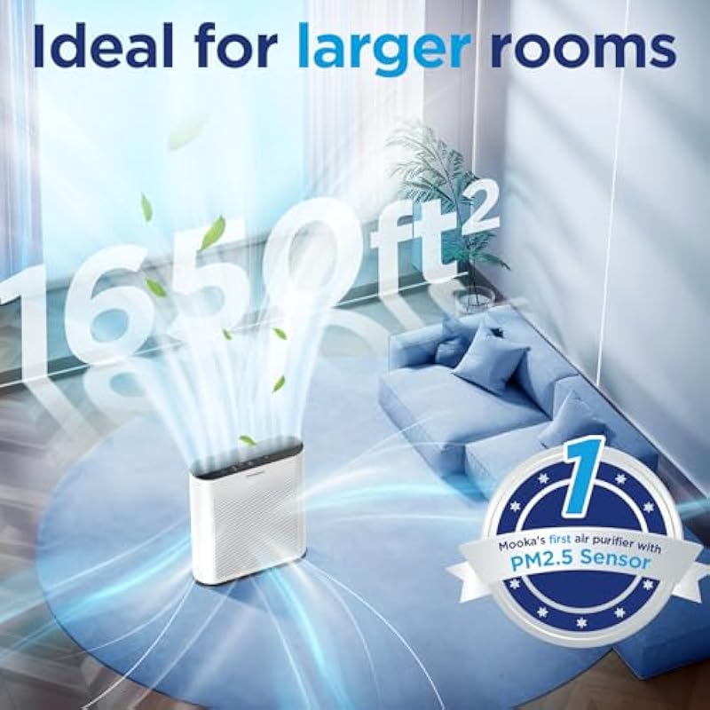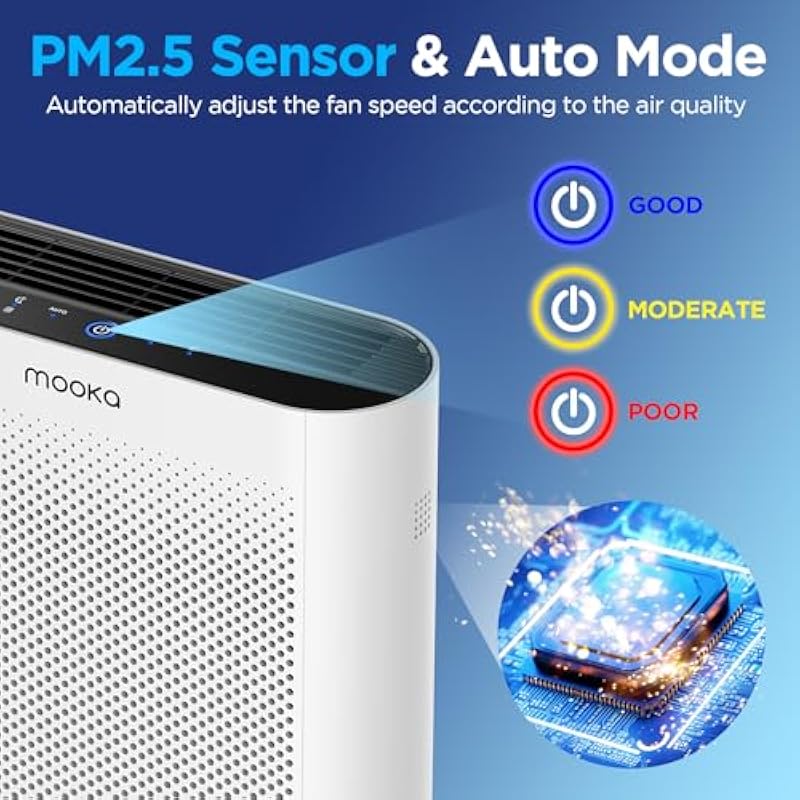 - PM2.5 AIR QUALITY SENSOR: MOOKA TL2867 air purifier utilizes the latest dust sensing technology with a built-in chip that detects the real-time air quality in the house. In auto mode, it will automatically adjust the fan speed according to the air quality of the room.
