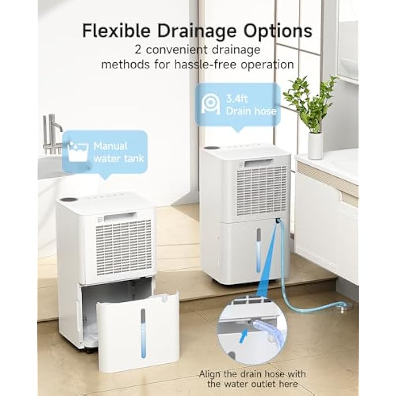 - Dual Drainage Options for Convenience — Experience flexibility with our innovative basement dehumidifier featuring dual drainage solutions. Start with the manual drainage option, equipped with a 0.53-gallon tank that automatically stops when full—no spills, no mess! For those long, humid days, effortlessly switch to the continuous drainage mode using the included hose, ensuring your space stays dry without the hassle of frequent emptying