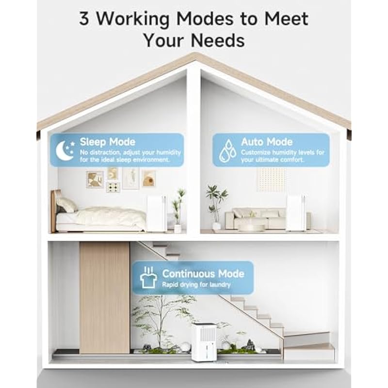- Tailored Comfort with 3 Modes — Experience ultimate adaptability with our three innovative modes. In Auto Mode, effortlessly customize humidity levels between 30%-80% to match your preferences. Continuous Mode provides rapid drying for laundry, keeping your clothes fresh and ready. Meanwhile, Sleep Mode turns your space into a serene retreat, ensuring peaceful, restful nights. Whatever the weather outside, create the ideal indoor climate for every occasion
