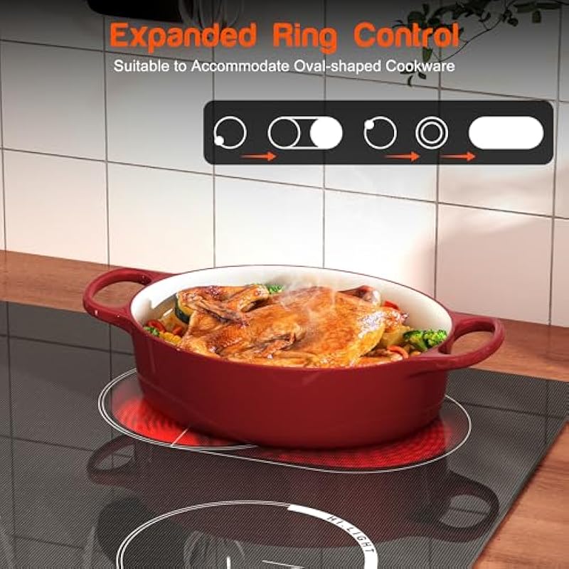- 🐸【Dynamic Expanded Zones】 Among the standout features of this electric cooktop is its Oval Zone functionality. It combines two separate heating elements into one, allowing for the flexibility to use large cookware such as a griddle or fish steamer or smaller pots and pans according to your needs. This feature significantly enhances the cooktop’s versatility, enabling you to effortlessly switch between cooking methods and catering to a range of recipes, from simmering sauces on a low heat to quick searing on high heat.