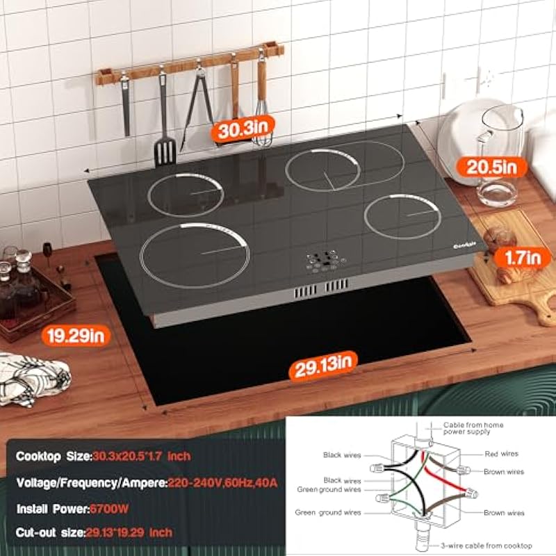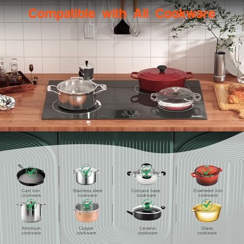 - 🐹【Suitable for All Types of Cookers】Cooksir electric stove top can be used with any type of cookware in your home, such as aluminium pans, copper pans, cast iron frying pans and non-magnetic stainless steel pans. But please make sure that the the bottom of the cookware should be flat. Cooksir 30 in 4 burner ceramic hob can heat your dishes efficiently with minimal heat loss. Product Size: 30.3″D x 20.5″W x 1.7″H.