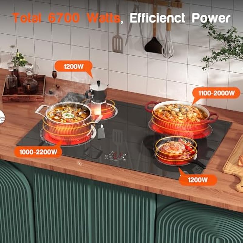 - 🐣【220-240v 6700W High Power】This 30 inch electric cooktop is suitable for AC220-240V, featuring 4 different cooking zones with total power 6700W. The top left 6.5″(165mm) round cooking zone has a maximum 1200W power; the lower left 9.1″(230mm) zones have a maximum 2300W power; the top right 6.5″(165mm) round cooking zone and 10.6″(270mm) oval zone have a maximum 1100W and 2000W power respectively; The lower right 6.5″(165mm) round cooking zone has a maximum 1200W power. Built-in Ceramic Hob 220-240v hard wired, need a professional electrician for wiring.