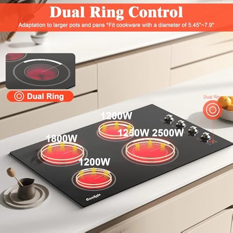 - đŽăMulti-Functional Ceramic StoveăThe four burner electric cooktop is equipped with various safety features to ensure a safe cooking experience. Inductive touch controls provide a safety lock function to prevent accidental activation and keep your children safe in the kitchen. Cooksir electric stovetop also has a residual heat indicator, “H” will keep slashing to alert you when the glass surface is still hot, reducing the risk of burns or accidents.