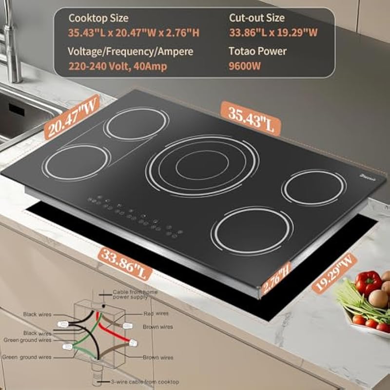 - 🐧| Built-In Design for Seamless Kitchen Integration | Designed for built-in installation, this 36-inch cooktop electric seamlessly integrates into your kitchen countertop, offering a streamlined and professional appearance. The 220V-240V hardwired connection ensures a stable and reliable power supply, making it suitable for modern kitchens. A professional technician is needed to do the wiring.