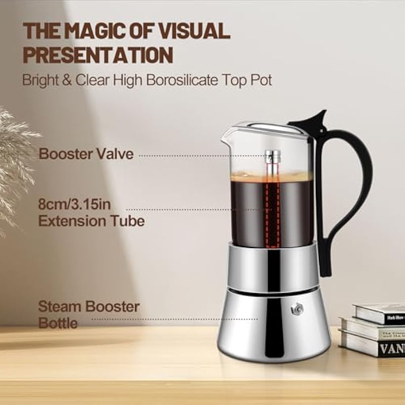 - Capacity: Standard espresso coffee cup is 50 ml. 4 cup/7.4 oz/220 ml; 6 cup/11 oz/330 ml. Mocha coffee maker with strong aroma can make delicious espresso for you in 5 minutes, you will be impressed by its rich flavor and aroma immediately. Induction heat guide plate is designed for various flat-bottomed cookware. The diameter is 16cm/6.3in,thickness is 0.34 cm/0.13 in