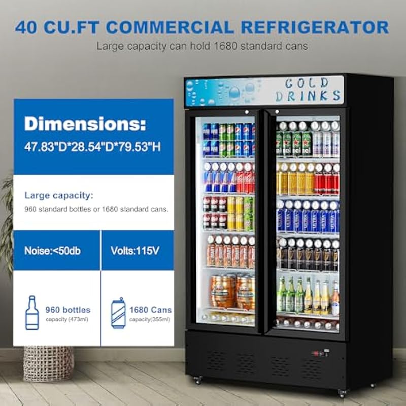 40 Cu.ft. Commercial Beverage Refrigerators Glass Door Refrigerator Upright Display Cooler with Soft LED Light and Adjustable Shelves for Restaurant Grocery Stores Home