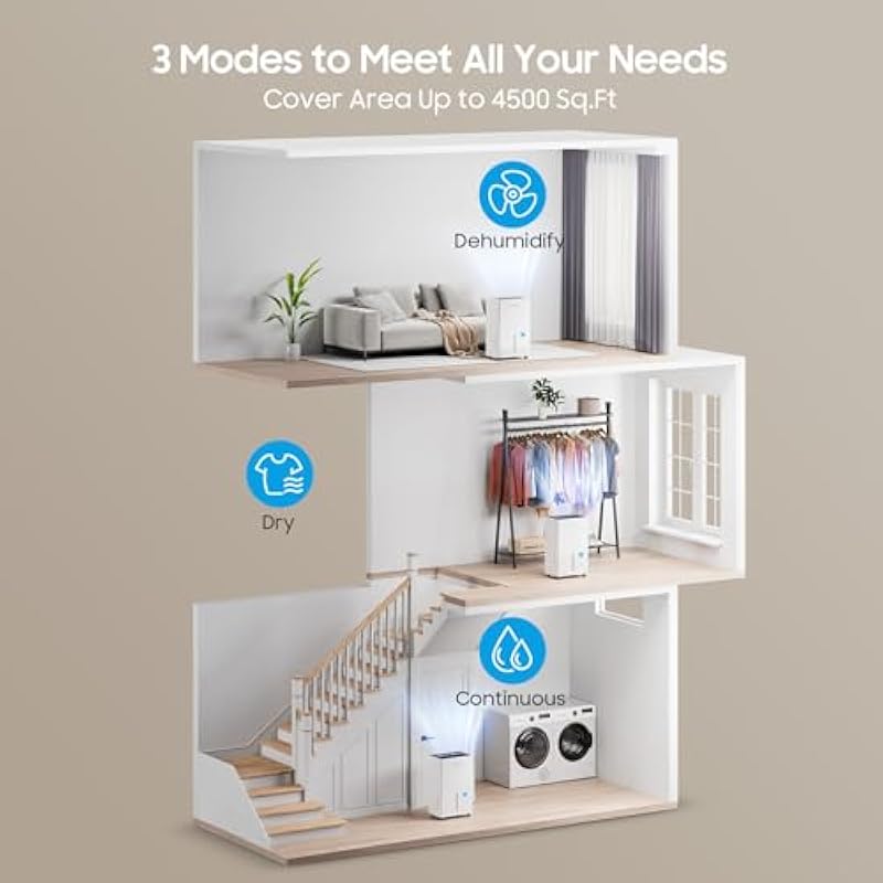 - THREE DEHUMIDIFICATION MODES: DEHU mode maintains healthy humidity levels in your home and can be used in wine cellars and storage rooms where space humidity is a definite need. DRY mode quickly dries wet clothes and cotton household items and prevents clothes from getting damp. CONT mode is suitable for spaces that require continuous dehumidification like basement, attic, etc