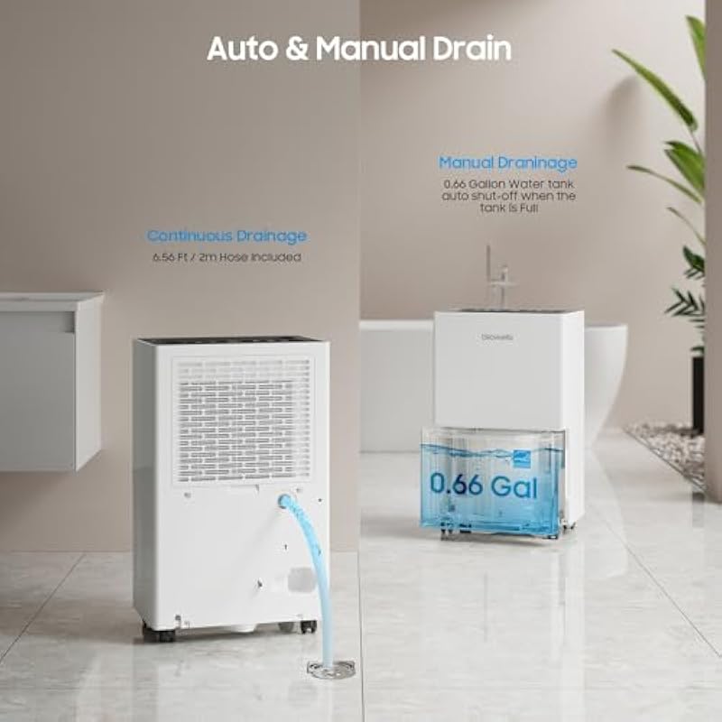 - Modern Convenient Design: This dehumidifier has a stylish and user-friendly design, 4 castors and side handles for easy to move room to room. Support manual drain with water tank(dehumidifier will stop when the bucket is full, and sound 10s to inform you.) or Automatic drainage with the included 6.56ft/2m hose. Also, the removable filter can be removed and cleaned for healthy and fresh air