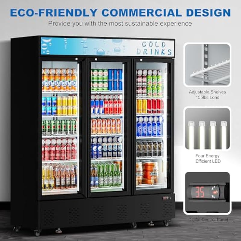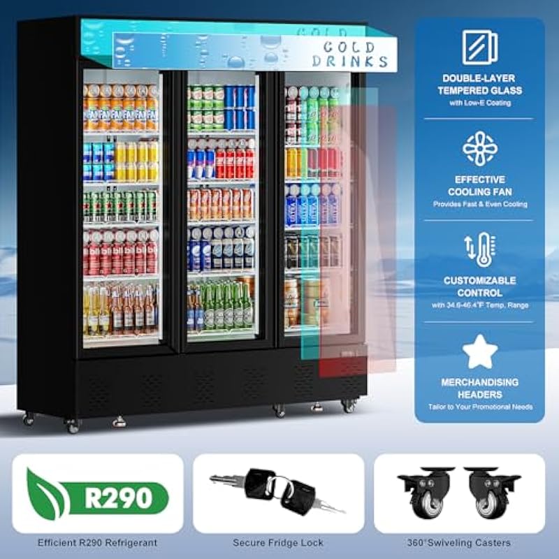 - This commercial beverage refrigerator comes with castor wheels to ensure easy mobility while maintaining stability when standing. TIPS: Please tear off the plastic protective film when you received the refrigerator and let it stay for over one day before power to use.