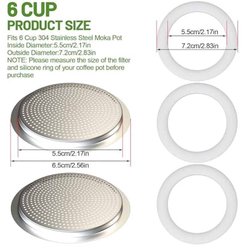 - Premium Quality Materials & Size: The filter is made of 304 stainless steel with an inside diameter of 5.5 cm/2.17 inches,outside diameter of 6.5 cm/2.56 inches.The silicone gasket is made of food grade heat resistant silicone with an inside diameter of 5.5 cm/2.17 inches,outside diameter of 7.2 cm/2.83 inches. Before purchasing, please measure the size of your coffee pot filter and gasket to ensure a perfect match. Note: Please choose the same filter material as your coffee pot