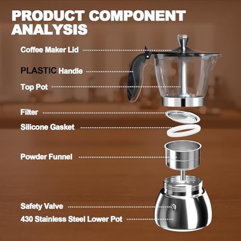 - Security First: The Espresso coffee maker lower pot is polished and designed with smooth stainless steel, with three-ring precision threads, equipped with a high-performance pressure-resistant safety valve, double safety guarantee design, effectively preventing over-pressure situations.The inside of the lower pot is not coated, but rather has a superb polished finish, a unique feature that enhances the overall texture and durability. The top pot is made of transparent plastic material, make ever
