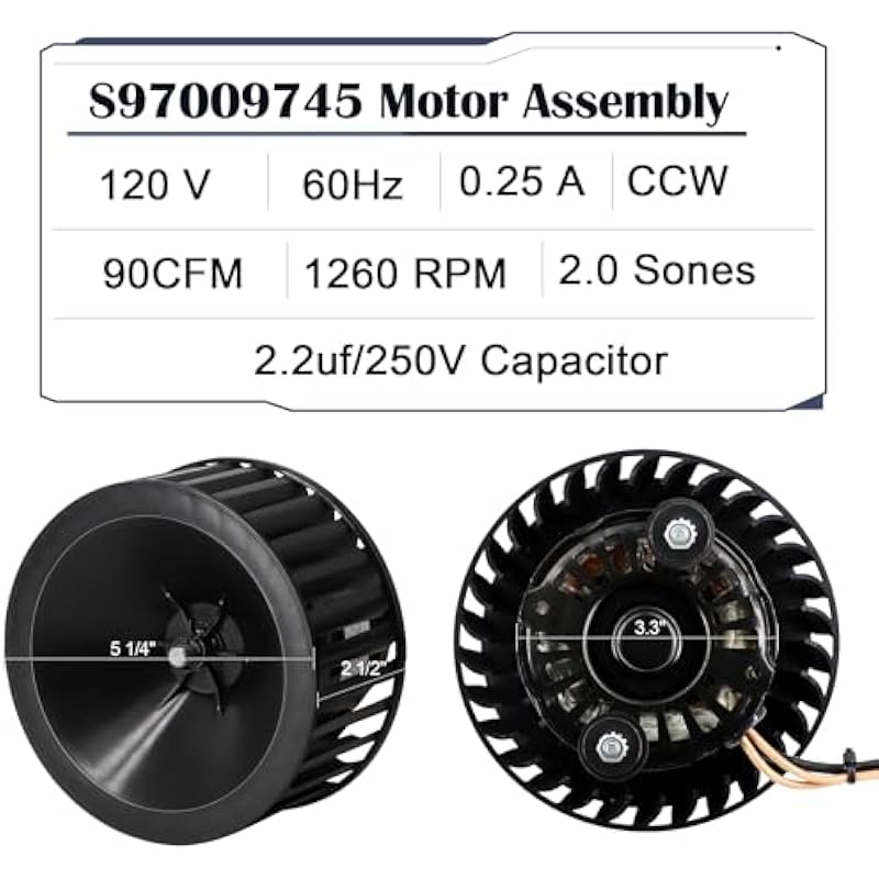 - ► Parameter of Broan S97009745 – 120 Volt, 60Hz, 0.25 Amps, 2.2uf/250V Capacitor, 1260 RPM, Rotation = CCW, Ball Bearing. 3.3” Dia x 2 1/4” H Motor, 5 1/4” Dia x 2 1/2” H Blower Wheel. ► Package: This broan 99080518 unit motor assembly includes a fan motor and blower wheel, ensuring a seamless replacement for select models.