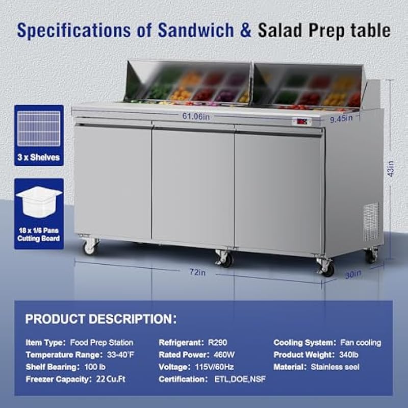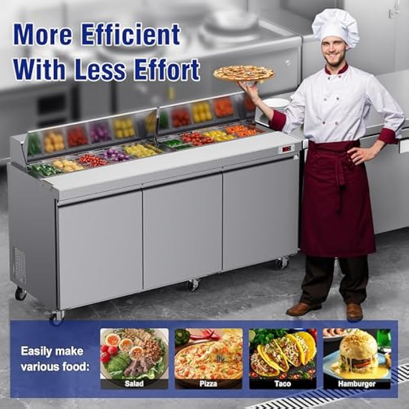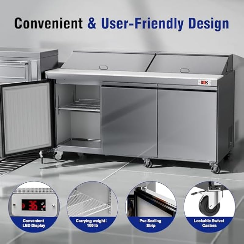 - This commercial-grade refrigerated prep table refrigerator is specially designed for use in restaurants, salad bar buffets, food carts, pizza shops, dessert shops, coffee shops, and other similar establishments. It is ideal for efficient sandwich and salad preparation, as well as other food items