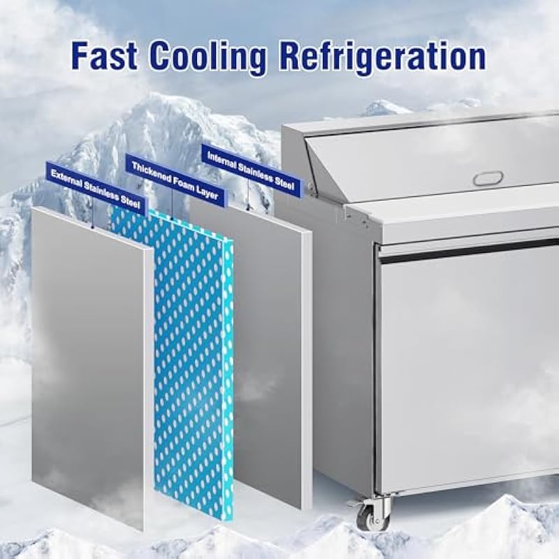 - Built in a high-performance compressor and powered by R290 refrigerant, this sandwich prep table refrigerator effectively lowers energy expenses. Its stainless steel exterior and interior are treated with a unique process that prevents fingerprints and minimizes cleaning time. Additionally, the sandwich prep table incorporates thickened insulation foam to ensure a consistent cooling temperature
