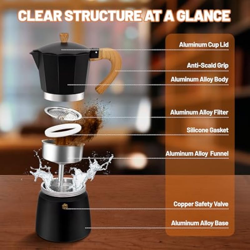 - Stainless Steel Design: Espresso coffee maker body through polishing design, smooth stainless steel material, three-ring precision thread, and pressure-tested safety valve to make your use process safer. Built-in safety relief valve to ensure that there will be no overpressure. It is corrosion resistant, rust resistant and easy to clean
