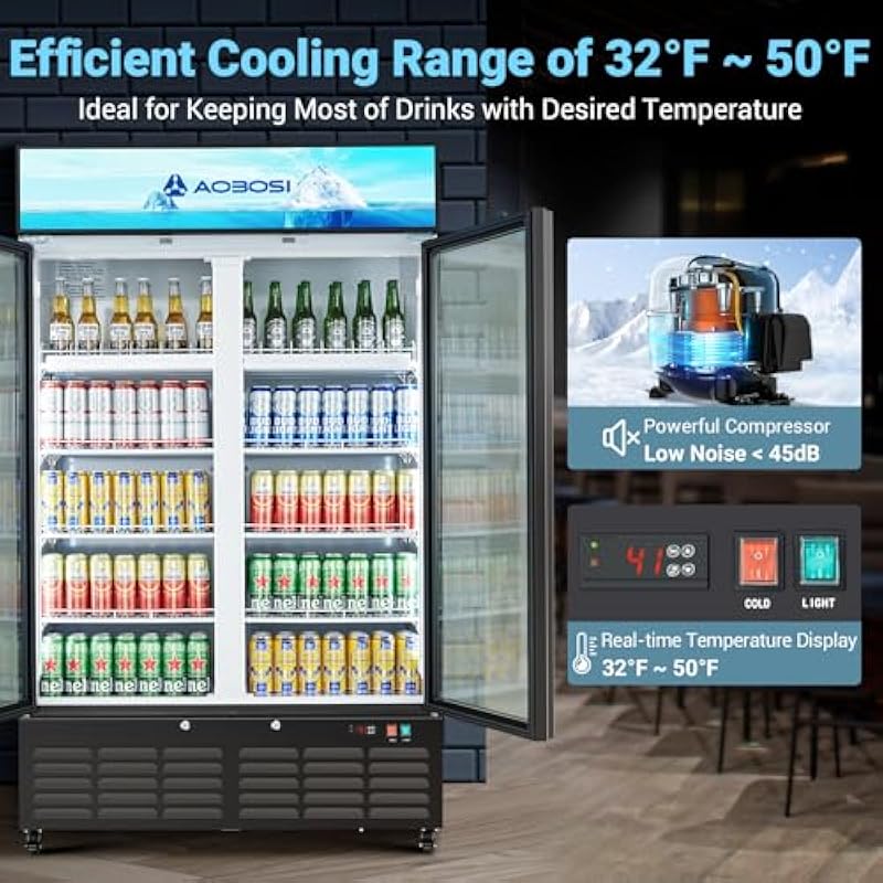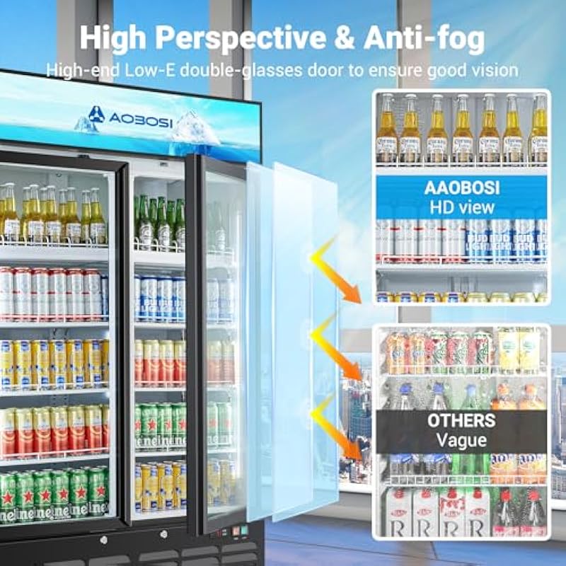 - 【Large Capacity&Adjustable Temperature Control】AAOBOSI 27.02Cu. Ft. merchandiser refrigerator allows you to stock up on a significant amount of beverages, beer, milk, food and even flowers. It’s ideal for restaurants, cafes, convenience stores,Bars, petrol stations, gyms and lobbies.Compared to traditional mechanical knob-based temperature adjustment, our commercial beverage refrigerators allow for more accurate and easier temperature adjustment with the push of a button and a digital display(32℉-50℉)