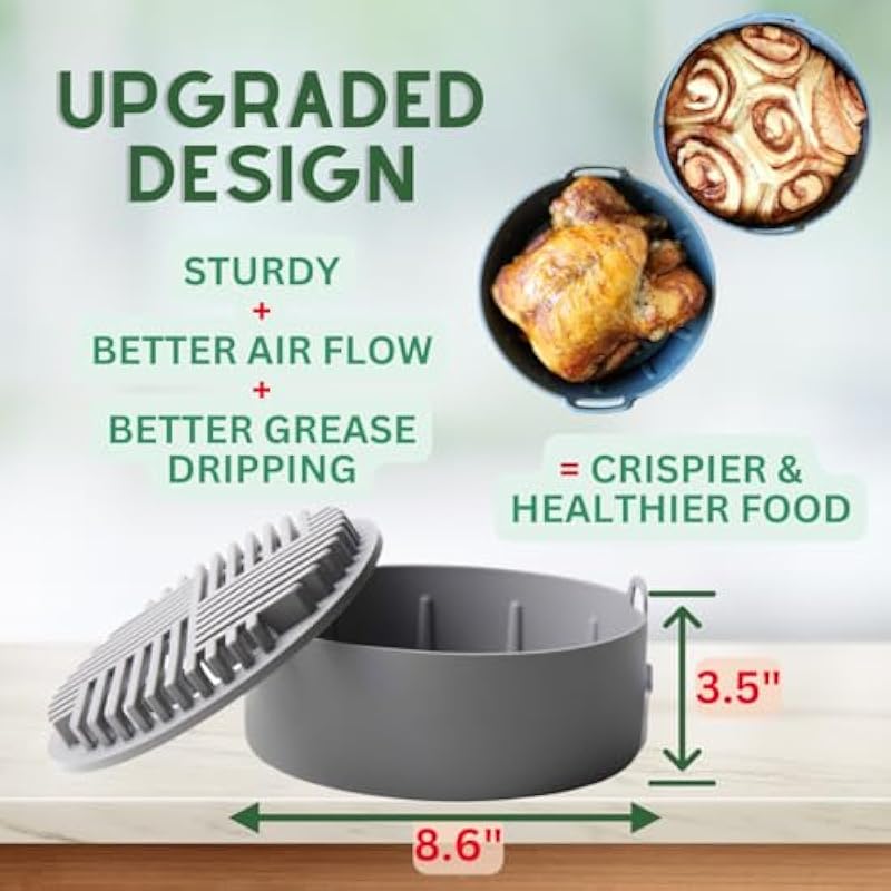 - 🌟Better Grease Capture & Air Circulation for Crispier food: The Grill Shaped bottom on this air fryer silicone pot keeps food away from dripped grease, so you can enjoy crispy food that’s full of flavor; The silicone air fryer basket also increases air circulation for faster, more uniform cooking; This newly designed air fryer liner is a game changer compared to other airfryer liners.