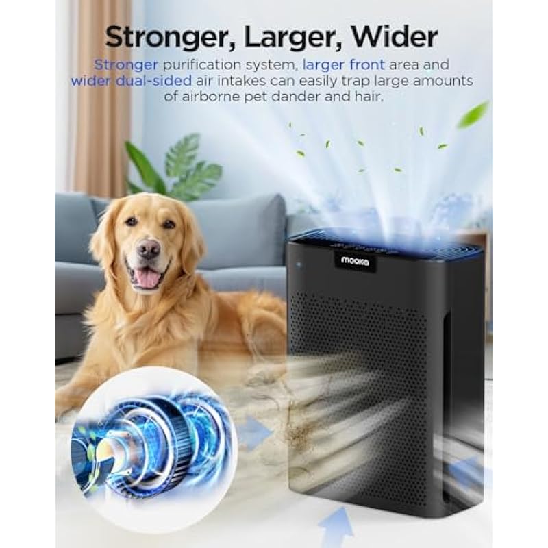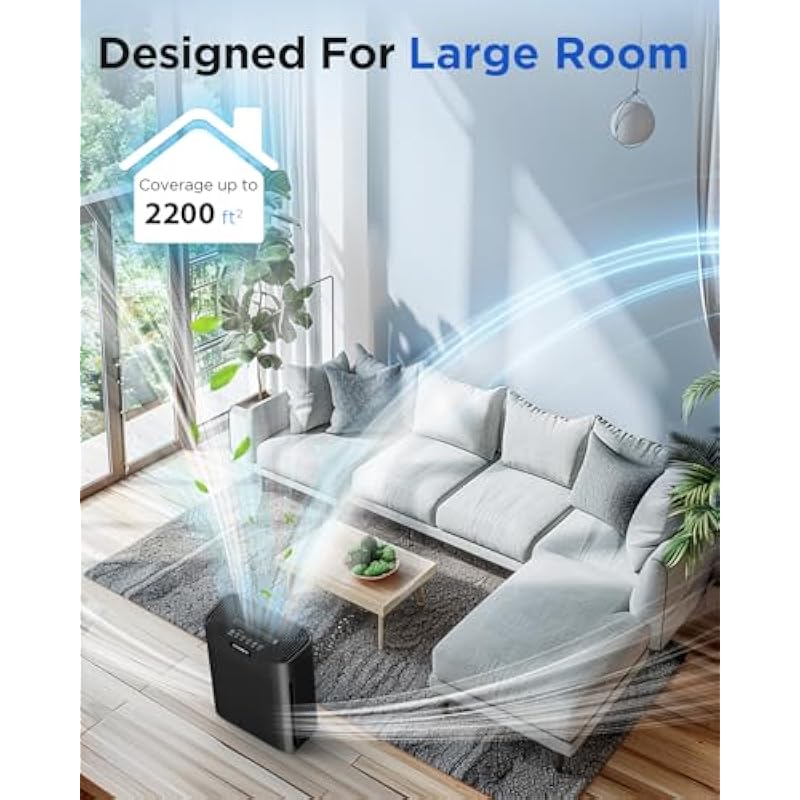- HIGHER AIR INTAKE & LARGER COVERAGE FOR PET LOVERS: this air purifier for home pets is designed with a larger front air inlet and wider dual-side air inlet. Compared to the single air inlet design, it can trap airborne pet hairs and odors more easily. This air purifier for large room can clean up to 2200 ft² per hour