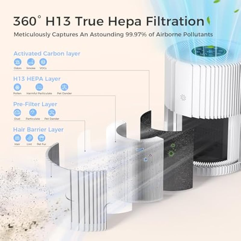 - 360° Airflow & H13 True HEPA Filtration: Elegantly engineered 360° surround air intake, coupled with the sophisticated H13 HEPA four-layer filtration system, meticulously captures an astounding 99.97% of airborne pollutants, transforming your living space into a sanctuary of purity and vitality.