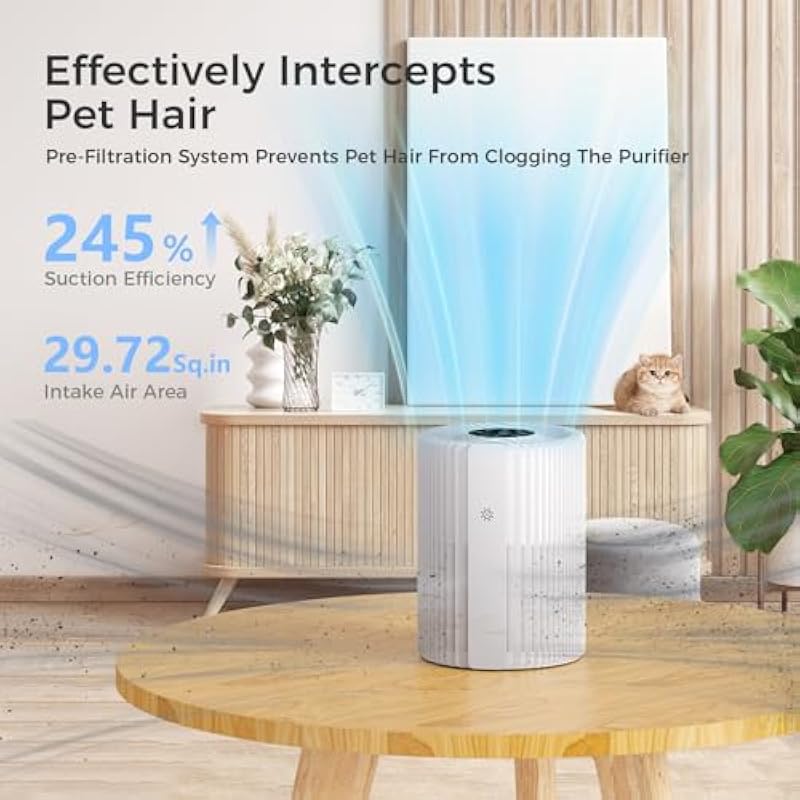 - Effectively Intercepts Pet Hair: Specially designed large grille pre-filtration system prevents pet hair from clogging the purifier, making cleaning and maintenance easy. 245% larger air intake area improves purification efficiency and area, easily purifying an area of 1095 sq. ft/hour.