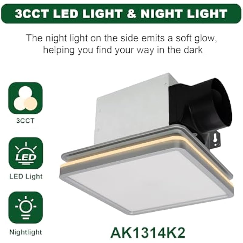 - MULTI-FUNCTIONAL LIGHTING: The bathroom exhaust fan offers adjustable color temperature of 2700K/4000K/5500K, allowing you to customize your sapce according to your preference. The night light on the side emits a soft glow, helping you find your way in the dark