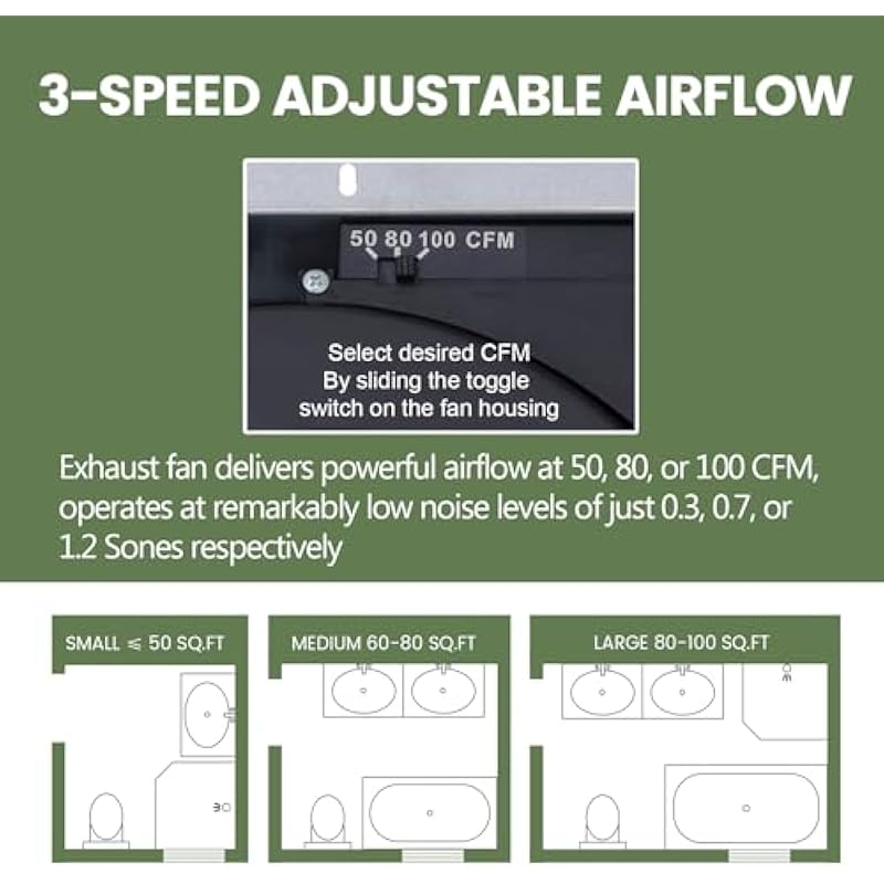 - Ultra-Quiet and Powerful Performance: Akicon bathroom exhaust fan with light operates below 1.2 sones. The airflow can select 50-80-100 CFM with the humidity sensor switch (sold separately), effectively removing moisture and odors from your bathroom