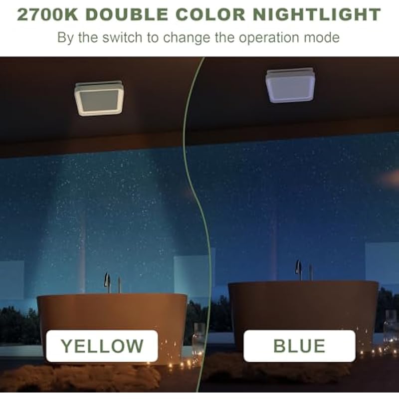 - 3CCT LED Light with Nightlight: Customize your bathroom experience with Akicon bathroom exhaust fan light. Control the 15W main light with color temperature variations(2700K/4000K/5500K), using the Akicon integrated dimmer switch (sold separately) to create the perfect ambiance. It also includes a 7W 2700K night light for yellow and blue double color