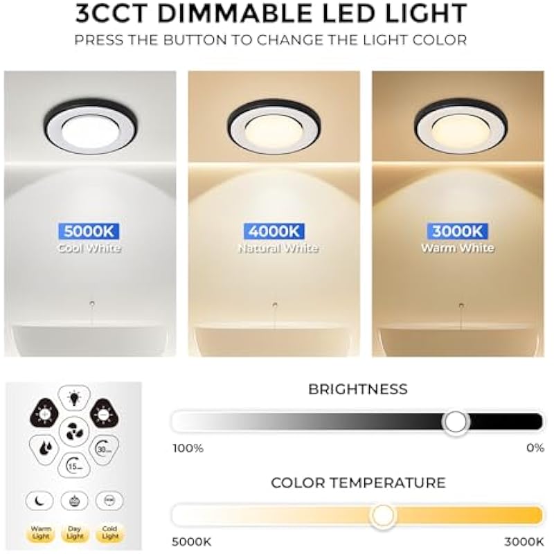 - [CONVENIENT REMOTE LIGHTING CONTROL] Easily customize your bathroom lighting from anywhere with the handy remote (batteries not included). This bathroom exhaust fan with light offers bright 5000K for getting ready, balanced 4000K for daily use, or warm 3000K for relaxing. Dimmable brightness and a soft night light make nighttime trips easy. Adjust lighting, fan speed, and timer from up to 26 feet away. Wall switch operation not supported