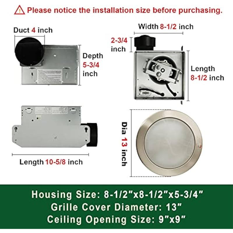 - EASY INSTALLATION: The bathroom fans for ceiling is easy to install or replace existing product for DIY’ers with no attic access required. Housing Dimensions 8-1/2″ x 8-1/2″ x 5-3/4″. Light Cover diameter is φ13. Click the installation guide on this page for more details and professional instruction