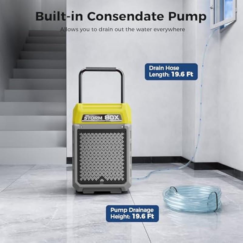 - ✔【Dehumidifier with Pump for Easy Drainage】This commercial dehumidifier with condensate pump will automatically drain out the water for the low-hassle operation. Plus, the 19.6 ft long drain hose and 19.6 ft drain vertical height maximize the flexibility of installation, you can drain anywhere easily with the condensate pump, perfectly humidity control equipment for industrial, commercial, water damage restore and home use