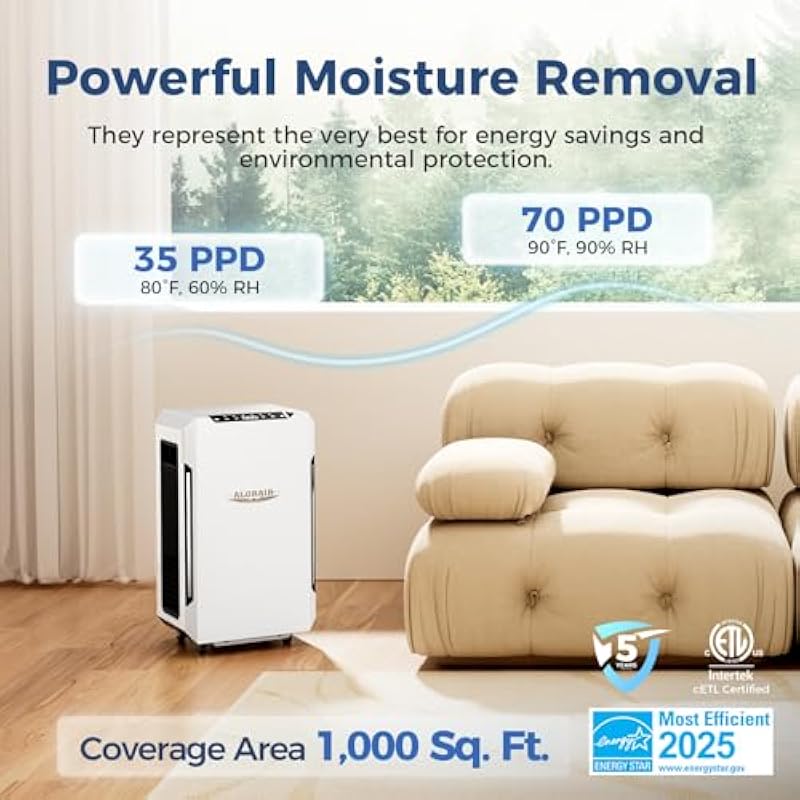 - Energy Star Most Efficient 2025: ALORAIR Sentinel Pro 35X is certified by Energy Star Most Efficient 2025, without sacrificing performance and comfort, reduce polutions to our nature environment. by using more efficient refrigeration coils, compressors and fans, removes same pints moisture, but energy consumption is reduced by 20-30% which is enough for your other energy star certified fridge functioning up to 3 months.