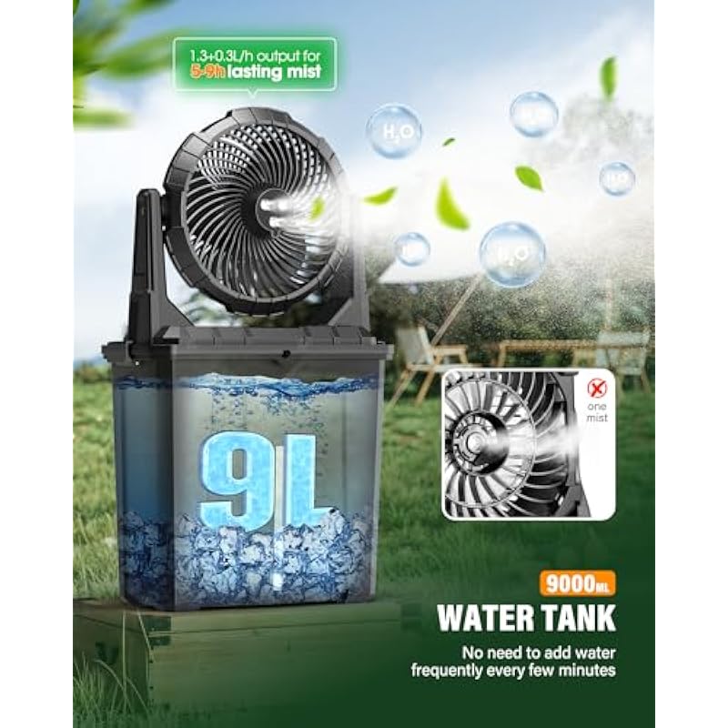 - 🌊【9L (2.4Gal) Large Bucket & Portable Handheld Design】 The 10 inch camping fan comes with a 2.4Gal (9L) water bucket, so you don’t need to spend extra money to configure a water bottle and it can be used as soon as you get it. The large-capacity design allows you to use it for 5-9 hours after filling it with water, no need to add water frequently every few minutes! When not in use, the mister fan portable can be turned over and stored in the bucket, making it easy to store and convenient to carry directly when traveling outdoors.