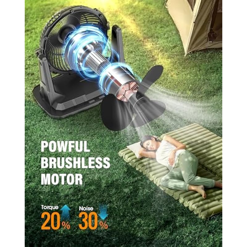 - 🔋【20000mAh & 3 Adjustable Speeds】The battery operated misting fan uses a 20000mAh high-performance lithium battery, which can provide 6-7 hours (High Fan+Mist) or 12-55 hours (Only fan) of working time. The mister fan is powered by a high power brushless motor with 3 different speed settings (weak, strong, and super strong). Its lightest wind speed mode works well to create a gentle breeze and there is only minimal white noise in the tent during the night. Its strongest wind speed mode can cool off a group!