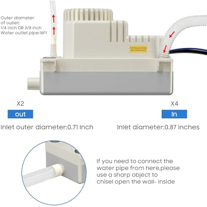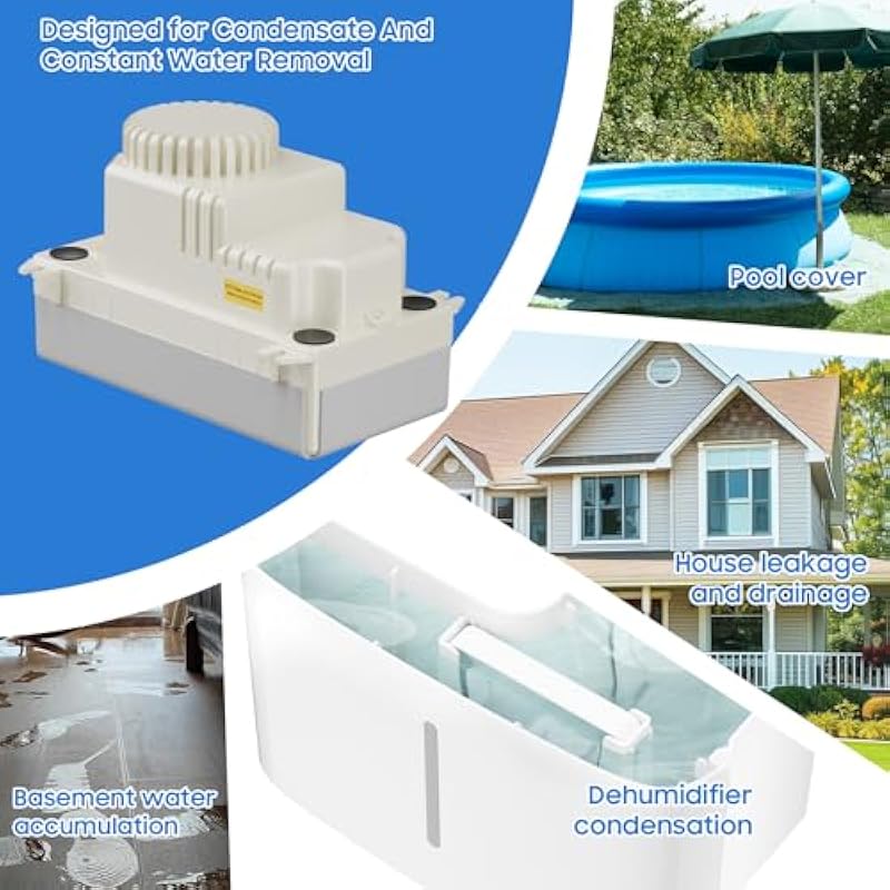 - High-Efficiency Performance:Equipped with a thermally protected motor, this automatic condensate pump ensures rapid drainage and ultra-quiet operation. Delivering a flow rate of 95 GPH and vertical lift capability up to 20 ft, its reliable AVAHUM switch guarantees automated functionality and extended durability. Ideal for HVAC systems, furnaces, dehumidifiers, and more.