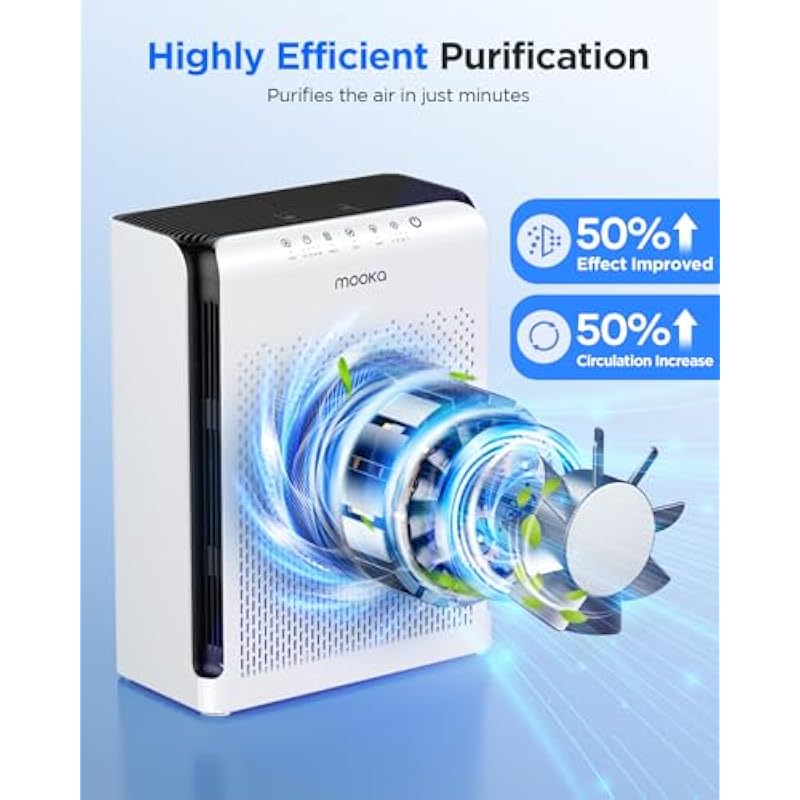 - MOOKA B-D02L AIR PURIFIER FOR LARGE ROOM: With the high-efficiency filtration system, the air purifier covers an area up to 1076 ft². 6 air changes per hour in 215 ft², 1 air changes per hour in 1076 ft². Modern design fits in any space from small to large rooms, bedrooms, living rooms, offices, nurseries, kitchens and basements. Perfect for pet owners, babies, children, the elderly, or anyone wanting to improve the air quality