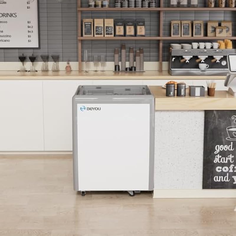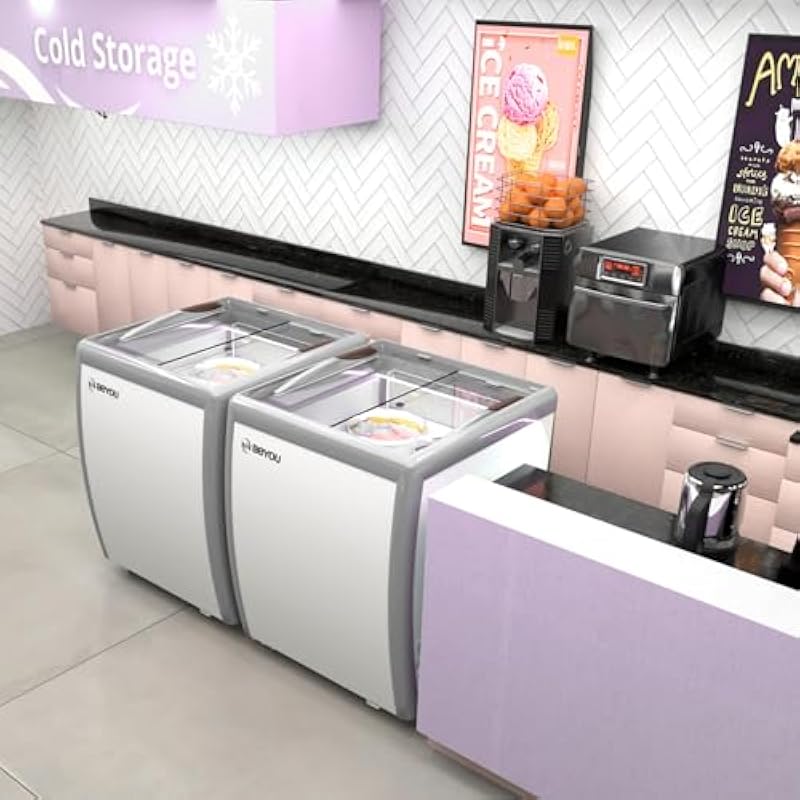 - Sliding Display Glass Door:Slides in either direction for easy scooping and serving of ice cream at ice cream vendors