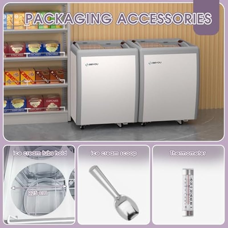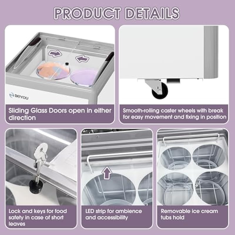 - Thoughtful Details: Equipped with lock and keys; Features LED strip; Comes with smooth-rolling caster wheels with break;1 Thermometer and 1 ice cream scoop