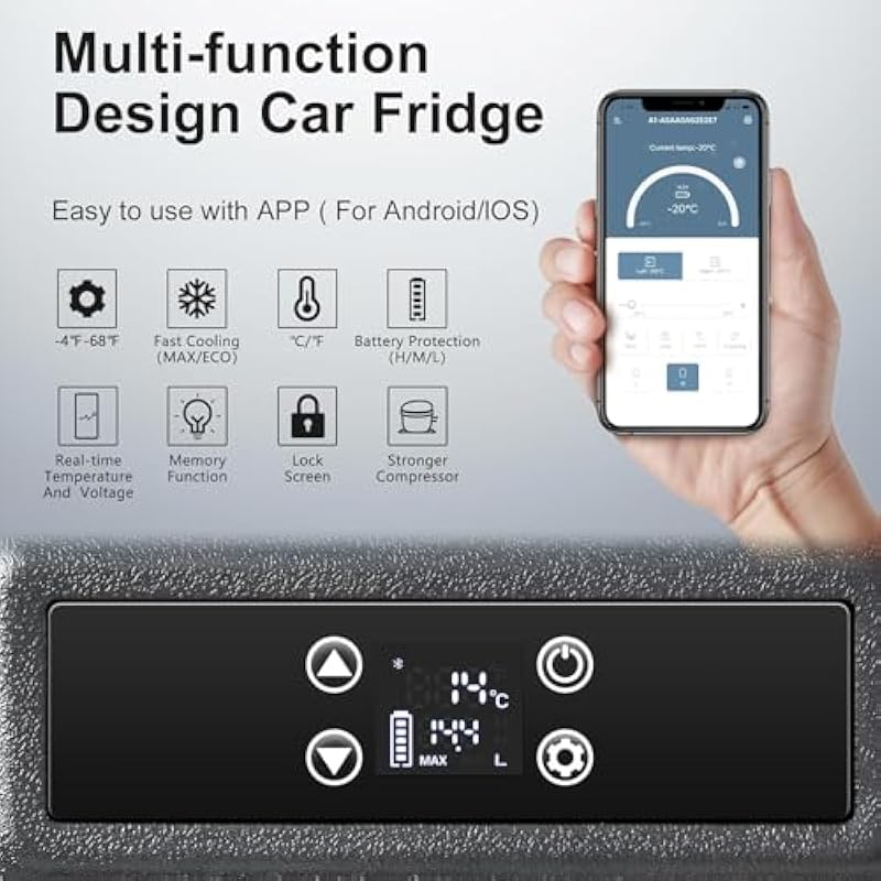 - 【ECO/MAX Modes and APP Control】portable refrigerator has two modes options.The fast cooling(MAX) mode only 15 mins cooling down from 68℉ to 32℉.The energy saving(ECO) mode is normal cooling speed that can reduce power consumption.Besides,You can use APP to control this car fridge from distance or in car.Intelligent temperature control function to meet the required temperature of various ingredients.