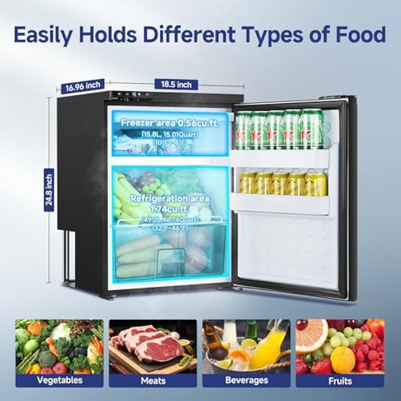 - Professional & Powerful Compressor: BODEGA RV Mini Refrigerator can be a fridge (49.2L) and freezer (15.8L) simultaneously! It can chill down to 4°F using powerful compressor cooling technology, from refrigeration to freezing. Adjust the freezing or refrigeration range of the car refrigerator from -4℉ to 46℉ as needed. This portable refrigerator and freezer is a good choices for outdoor activities such as camping, picnics, road trips, and more. RV refrigerator to accompany you on your journey